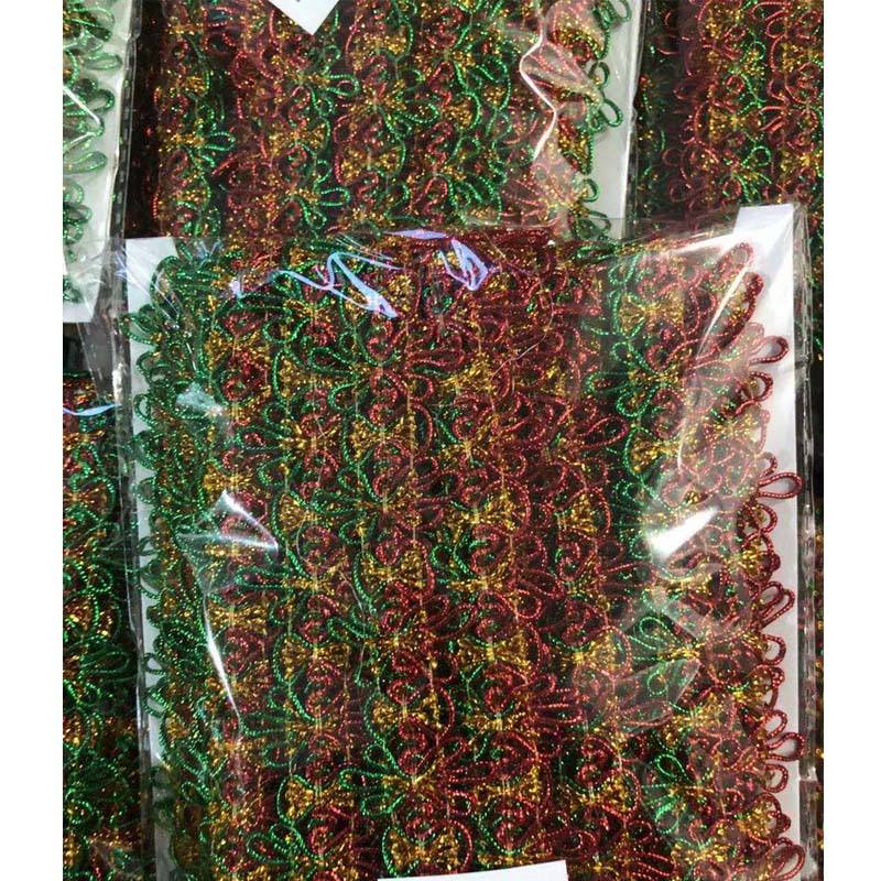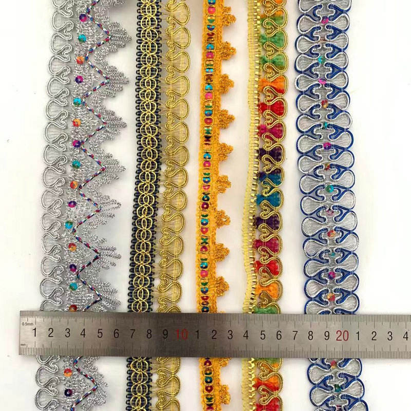 Обравни прибор Златни и сребрни металични гранични обриши Мултицолор Секуин Златна нит Металлиц чипка украшена златним и сребрним биколораним металним жицама и седам боја, ствара величанствени и сјајан ефекат ивице. Погодан је за украшавање маншета, огрлица и хемс врхунске одеће као што су вечерње хаљине, сценски костими и венчанице. Материјал је лаган и флексибилан, не бледи или пилује и подржава прилагођену ширину и обрасце, додајући луксузни сјај према одећи.