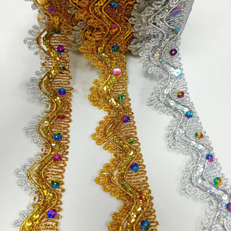Прибор за одећу Златна и сребрна металик гранична површина чипке Мултицолор Секуин Голд Тхреад Металлиц Лаце Трим