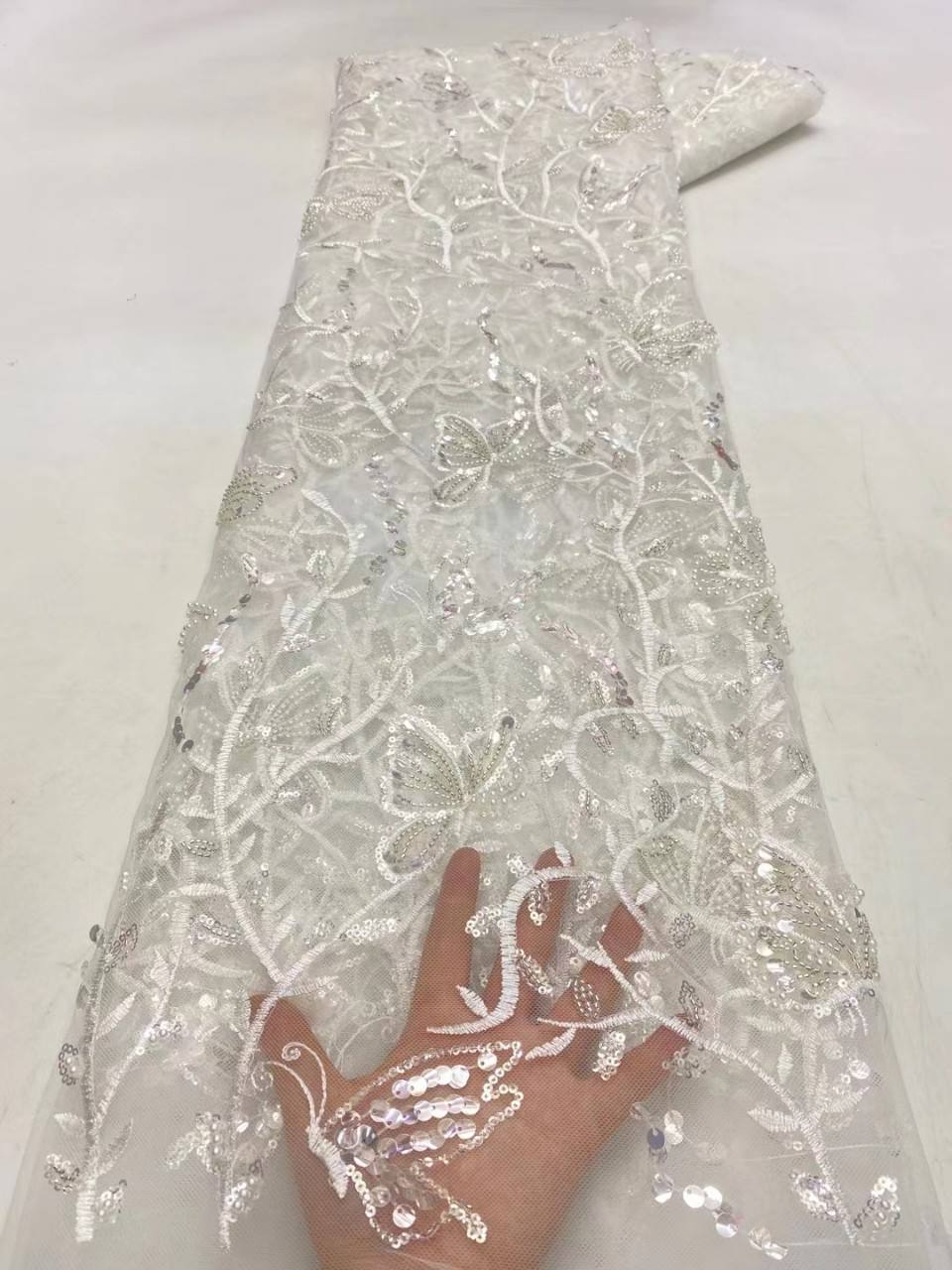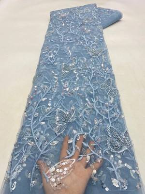 Шарено венчање венчања тканина 3Д лептир Беадед Везени од стране дводимензионалних 3Д дизајна са 3Д лептира, то је луксузан и изузетан, посебно прилагођен за врхунске венчане хаљине и вечерње хаљине. Свако двориште је фино везено са ефектима шљокица и перлицама. То је лаган и прозрачан, погодан за прављење ведриних велова, украса за хаљине или вечерње хаљине.
