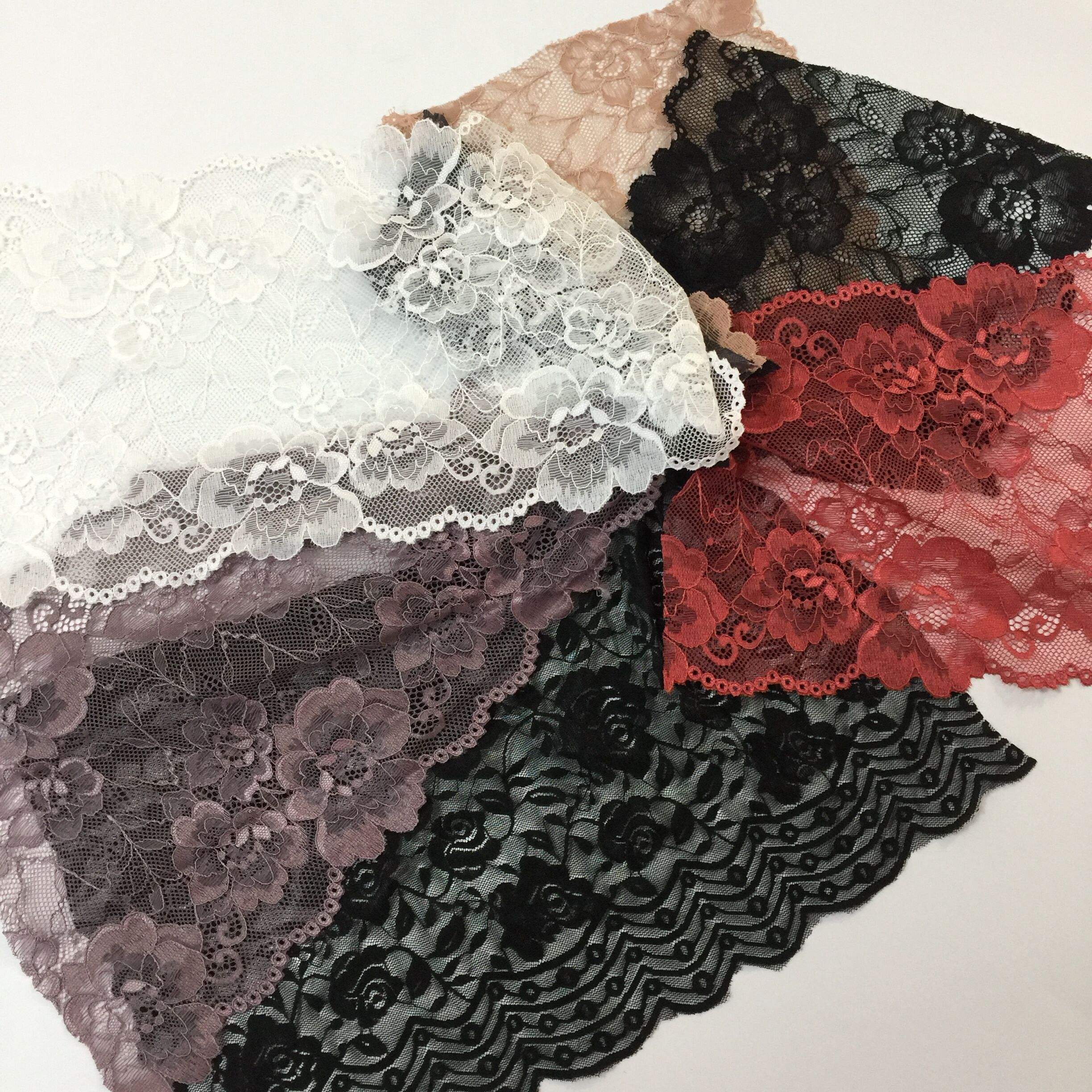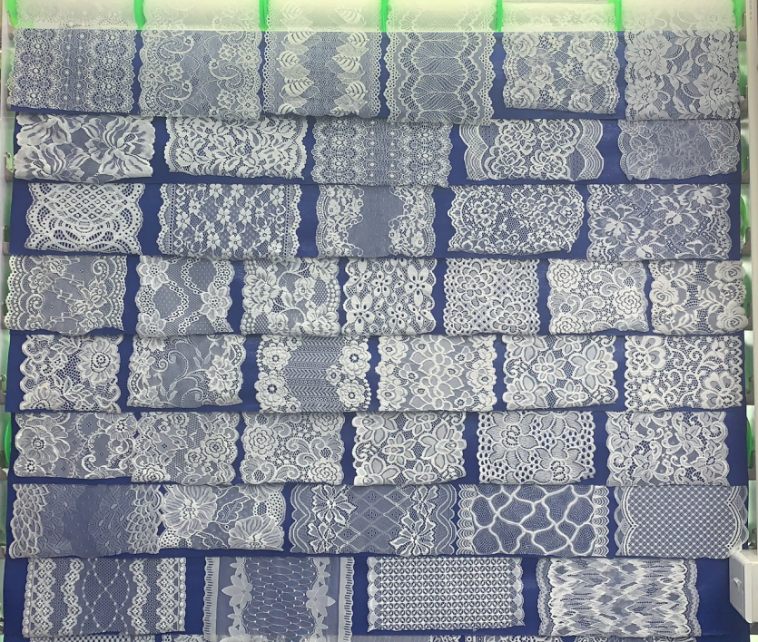 Хот Селе Фанци Нилон Спандек Лаце Стретцх Цлаце Трим Еластична чипка за доње рубље и доње рубље од високе еластичности најлон Спандек Мешави материјал, мека је, дишено и има снажну отпорност без деформације. Погодно је за трошење приближавања, попут доњег веша, Схапевеар и одећа за одрасле